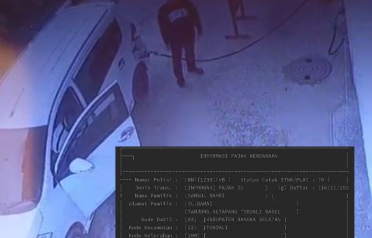 Belakangan, identitas kendaraan tersebut mulai terkuak. Mobil Suzuki Ertiga dengan nomor polisi BN 1239 VB tercatat atas nama Samsul Bahri, beralamat di Jalan Damai, Tanjung Ketapang, Kecamatan Toboali, Kabupaten Bangka Selatan.