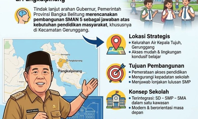 BANGKA BELITUNG — Pemerintah Provinsi Kepulauan Bangka Belitung bergerak cepat menjawab kebutuhan pendidikan masyarakat di Kota Pangkalpinang. Menindaklanjuti arahan gubernur, pemerintah provinsi merencanakan pembangunan SMA Negeri 5 Pangkalpinang di Kecamatan Gerunggang sebagai solusi atas tingginya kebutuhan akses pendidikan menengah di wilayah tersebut.